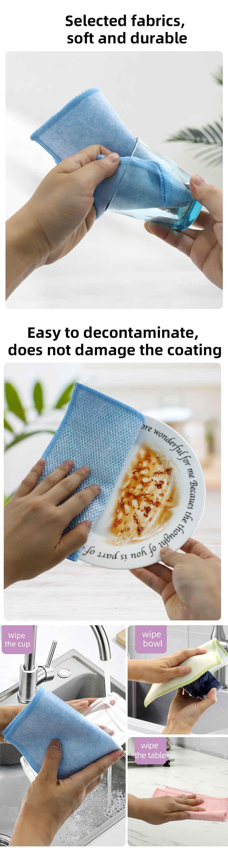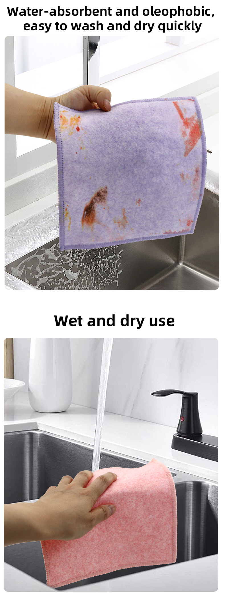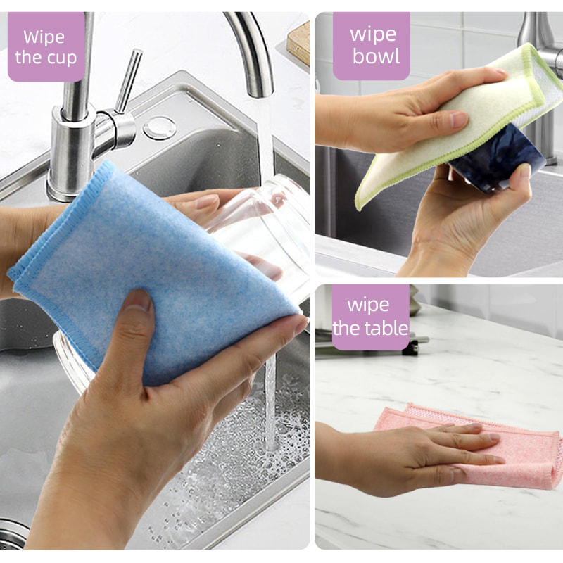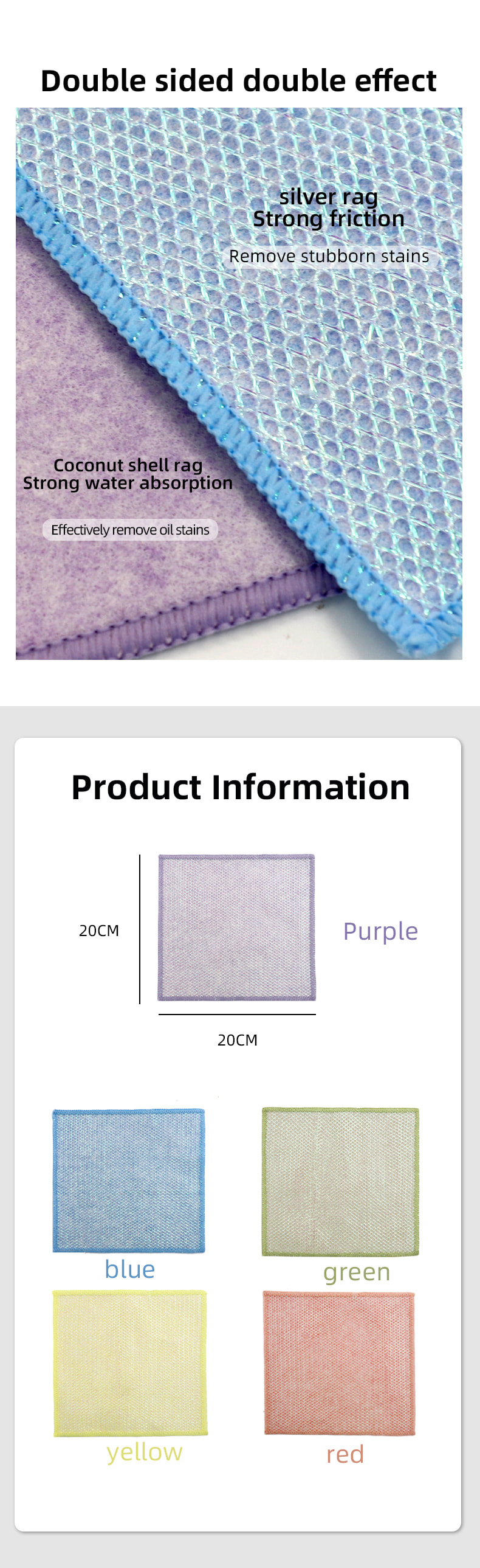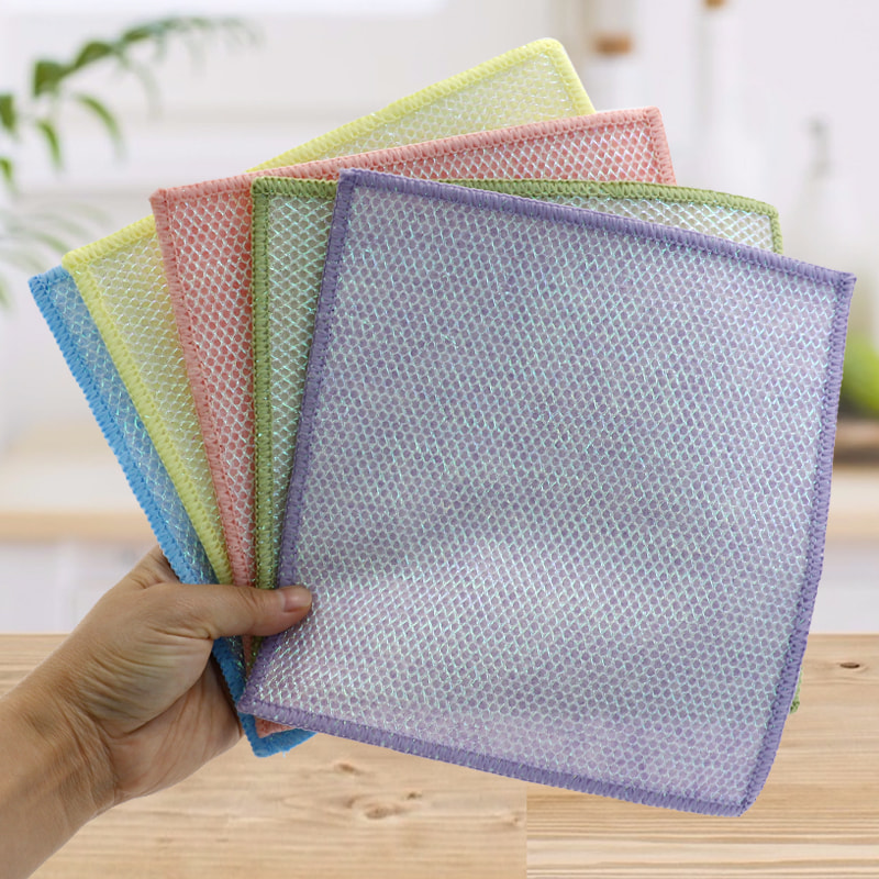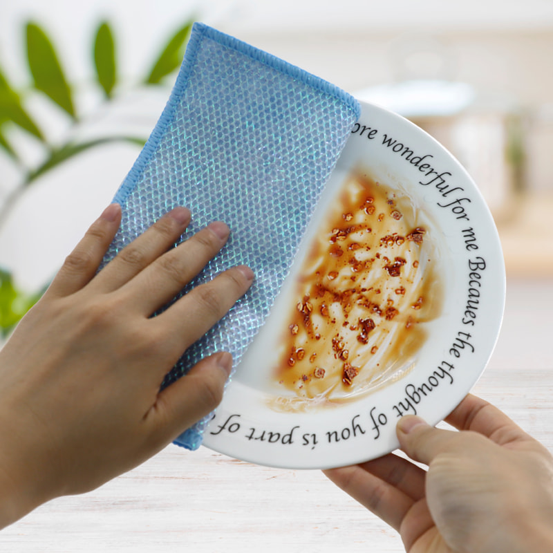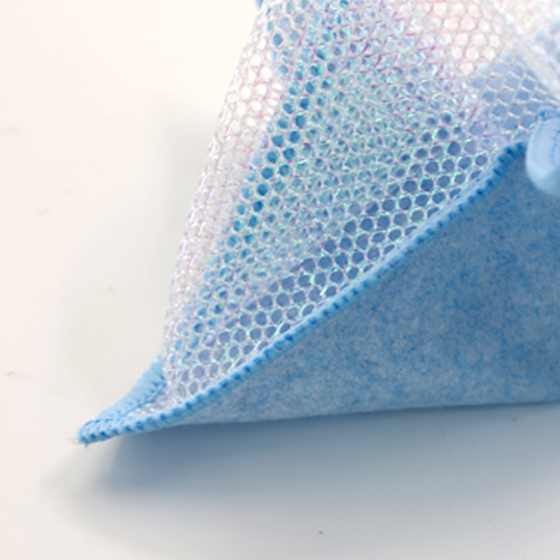 Espesyal na hugis na istraktura, makulay, mataas na hitsura; Ang isang gilid ay makulay na tela sa paglilinis na may malakas na kakayahan sa pag-scrape, at ang kabilang panig ay tela ng mata, na nakakatugon sa dalawahang pag-andar ng paglilinis habang nag-i-scrap; Ito ay walang langis at may malakas na pagsipsip ng tubig. Ang isang gilid ay itinatanim ng makukulay na sutla na may iba't ibang pattern, at ang kabilang panig ay hindi mamantika at tubig-absorbing viscose na ibabaw ng tela, na maganda at maaaring matugunan ang dalawahang pag-andar ng pagkayod at pagkayod sa isang gilid.